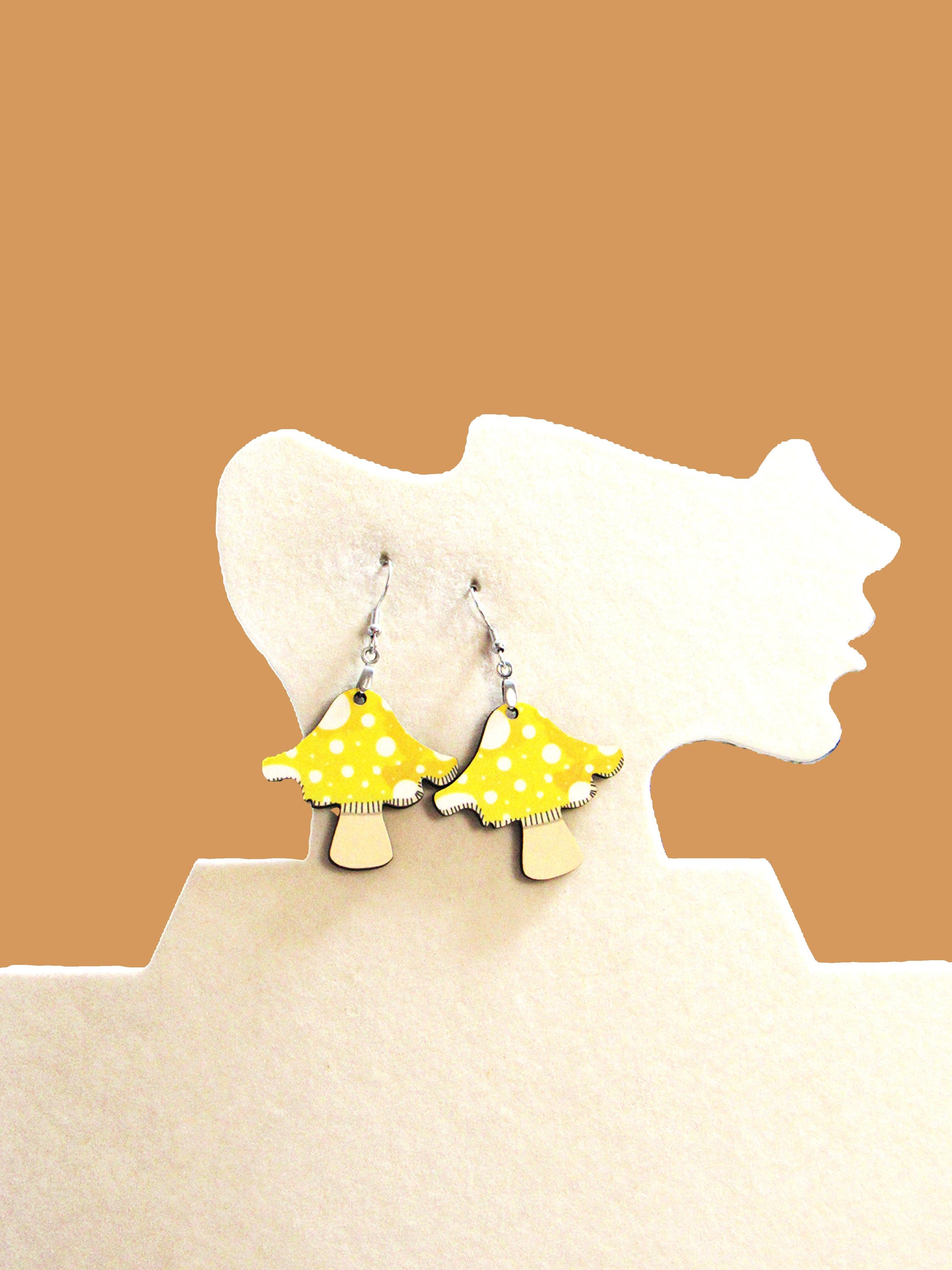 Add a playful touch to any outfit with these 1.5-inch distressed mushroom-shaped earrings. Crafted from lightweight MDF and featuring hypoallergenic wire, they promise comfort alongside unique style. With a total length of 2.5 inches including the wire, these yellow mushroom earrings are perfect for those seeking a charming accessory that stands out without irritation.