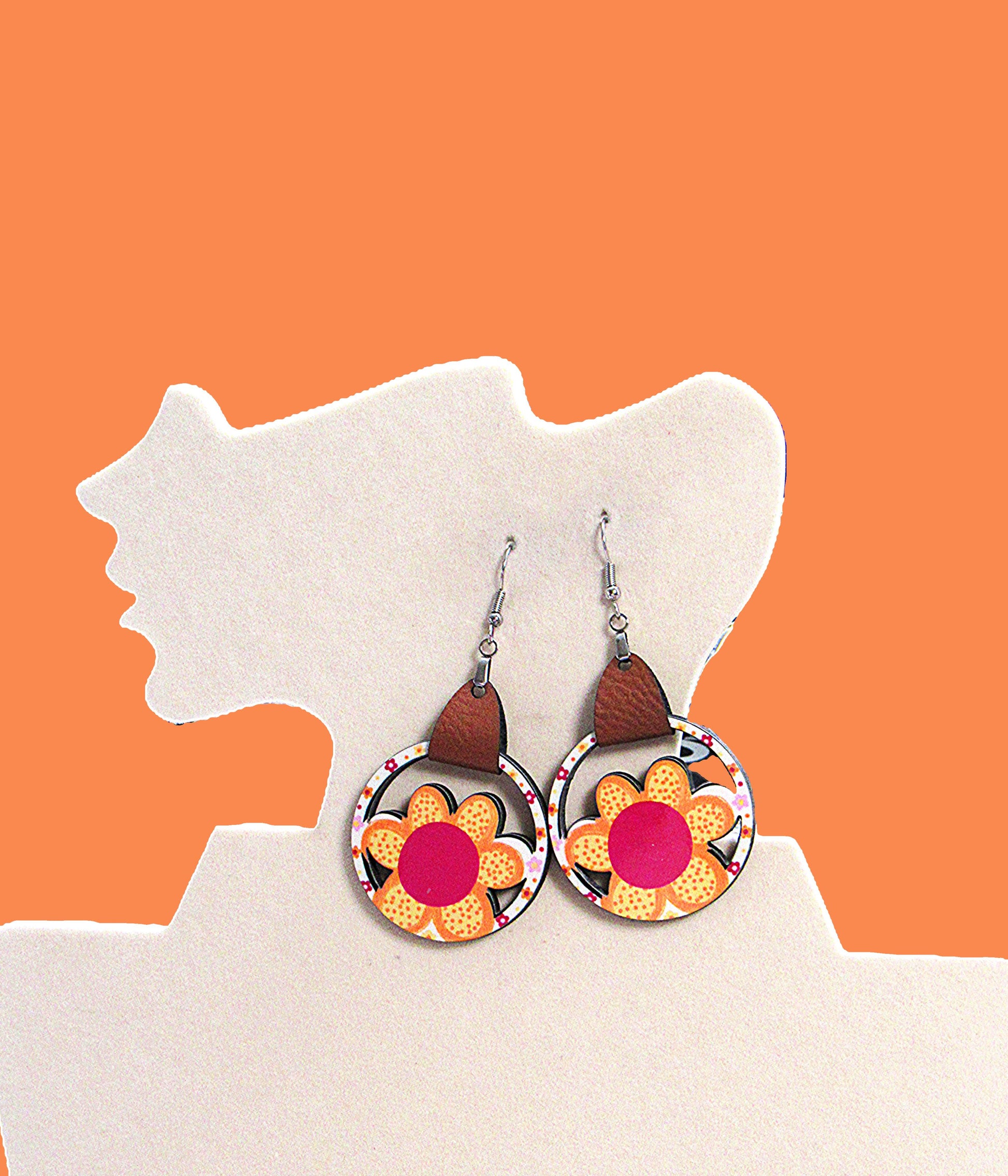 These Faux Leather Flower Sublimated Earrings feature a sturdy 1.5-inch MDF base and a total length of 2.75 inches, offering a bold yet comfortable statement. Crafted with hypoallergenic wire and a soft faux leather strap, they ensure irritation-free wear for sensitive ears. Perfect for adding a touch of floral charm to any outfit while keeping comfort and style in balance.