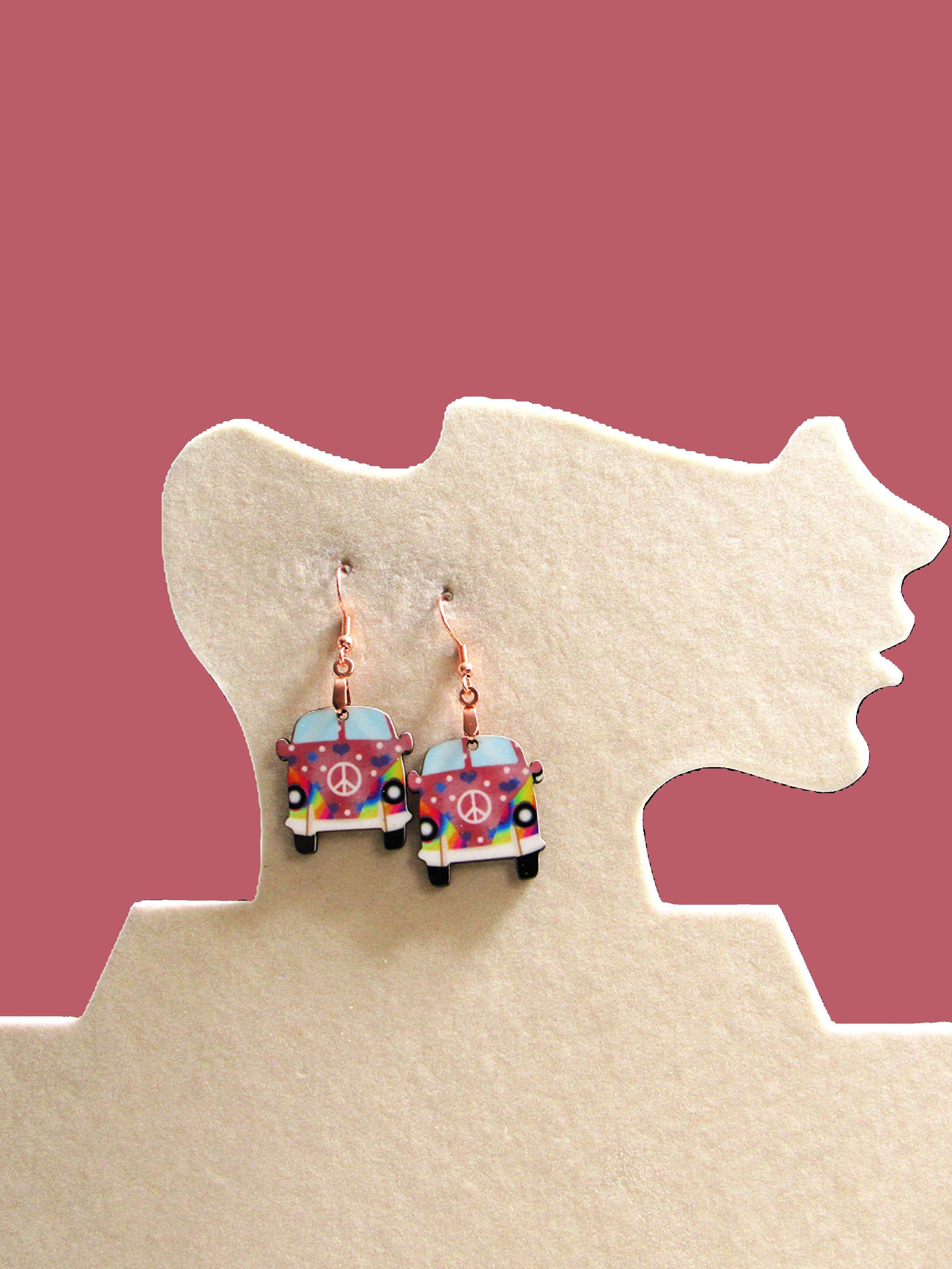 Add a pop of playful charm with these Hippie Van earrings! Crafted from lightweight MDF and featuring hypoallergenic wire, they offer comfort and style for sensitive ears. Each earring shapes a cute pink van that measures 1 inch wide and extends to 2 inches in total length, making them a fun, eye-catching accessory for any day. Perfect for adding a dash of retro road trip vibes to your look!