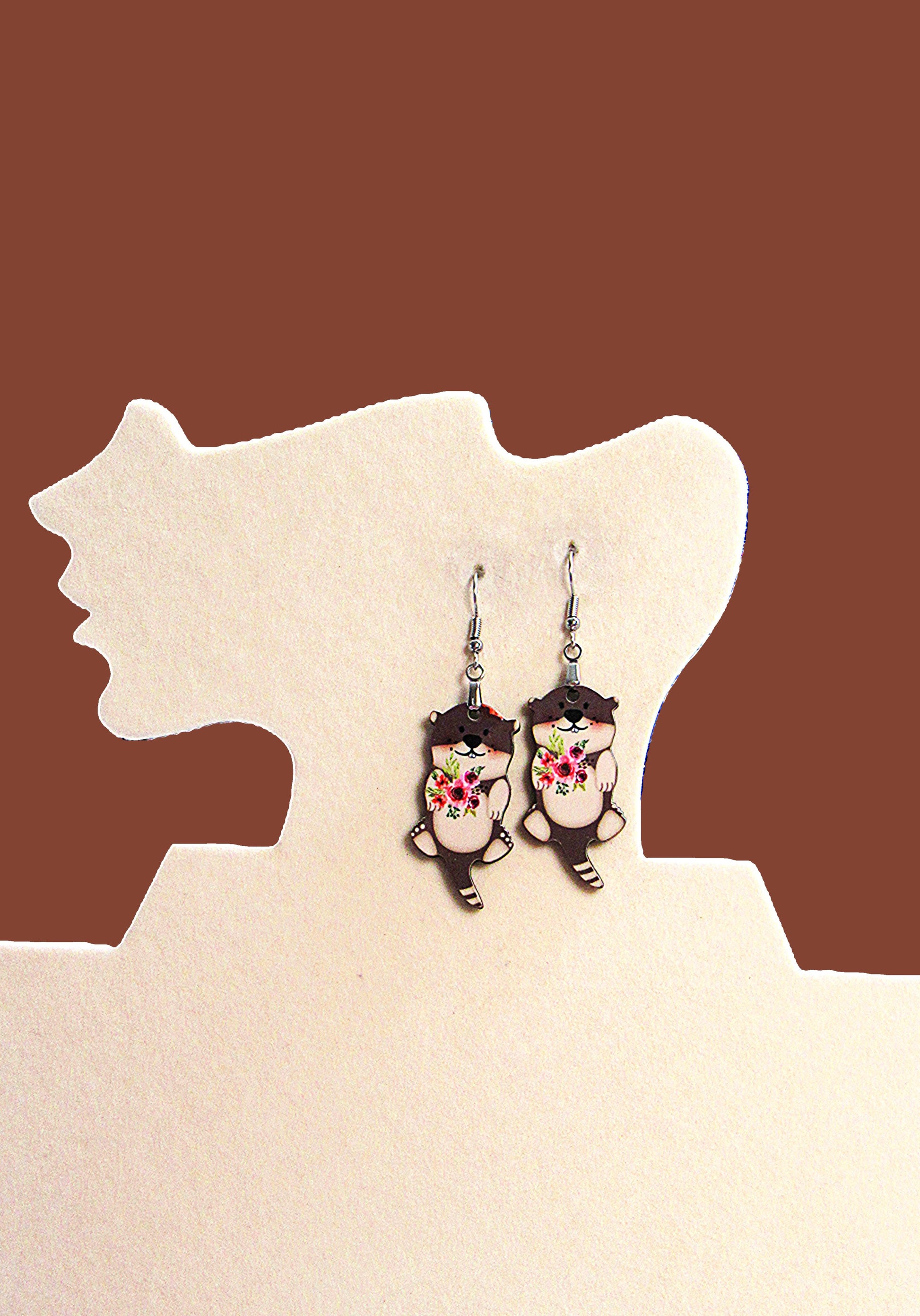 These otter-shaped sublimated earrings feature a 1.5-inch base and a total length of 2.5 inches, crafted from durable MDF material. The hypoallergenic wire ensures comfortable wear for sensitive ears, making them a charming and safe accessory for everyday use. Add a playful touch to your style with these lightweight, eye-catching earrings.