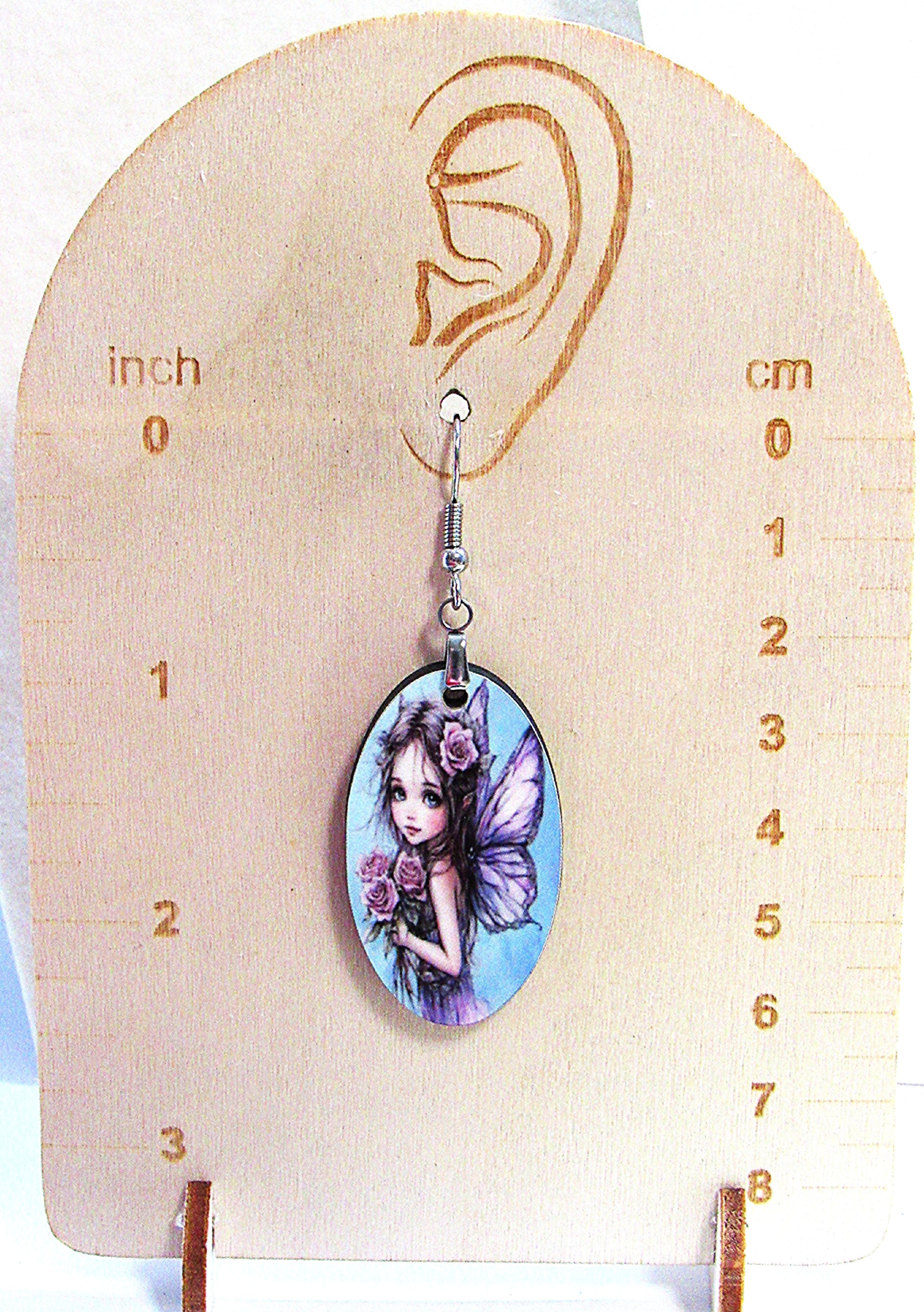These oval-shaped earrings feature a 1.5-inch MDF base with a total length of 2.5 inches, designed with a delicate blue fairy theme. Crafted with hypoallergenic wire, they offer comfort for sensitive ears while adding a whimsical touch to your look. Perfect for those who appreciate lightweight, charming accessories.