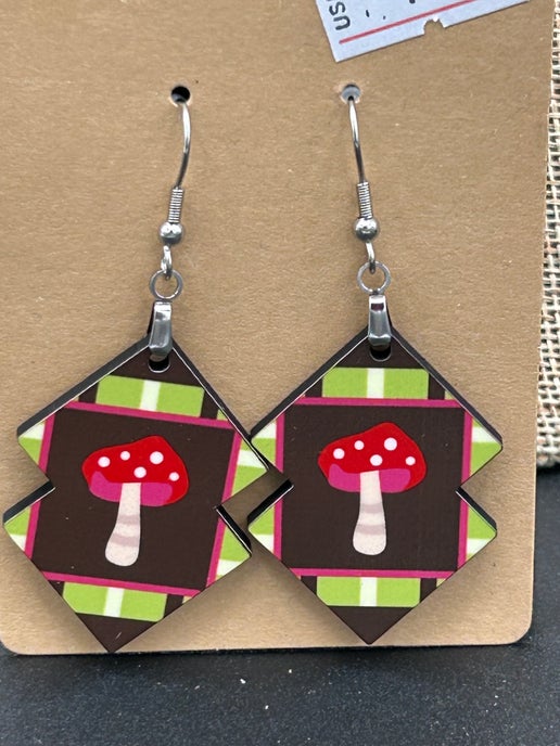 Add a touch of whimsy to your look with these Double Boho Shaped Sublimated Earrings. Crafted from durable MDF, each earring measures 1.5 inches at the base and 2.5 inches in total length, featuring playful brown and green hues accented by a charming red mushroom design. The hypoallergenic wire ensures comfortable wear all day long, making these earrings the perfect playful accessory for any outfit.