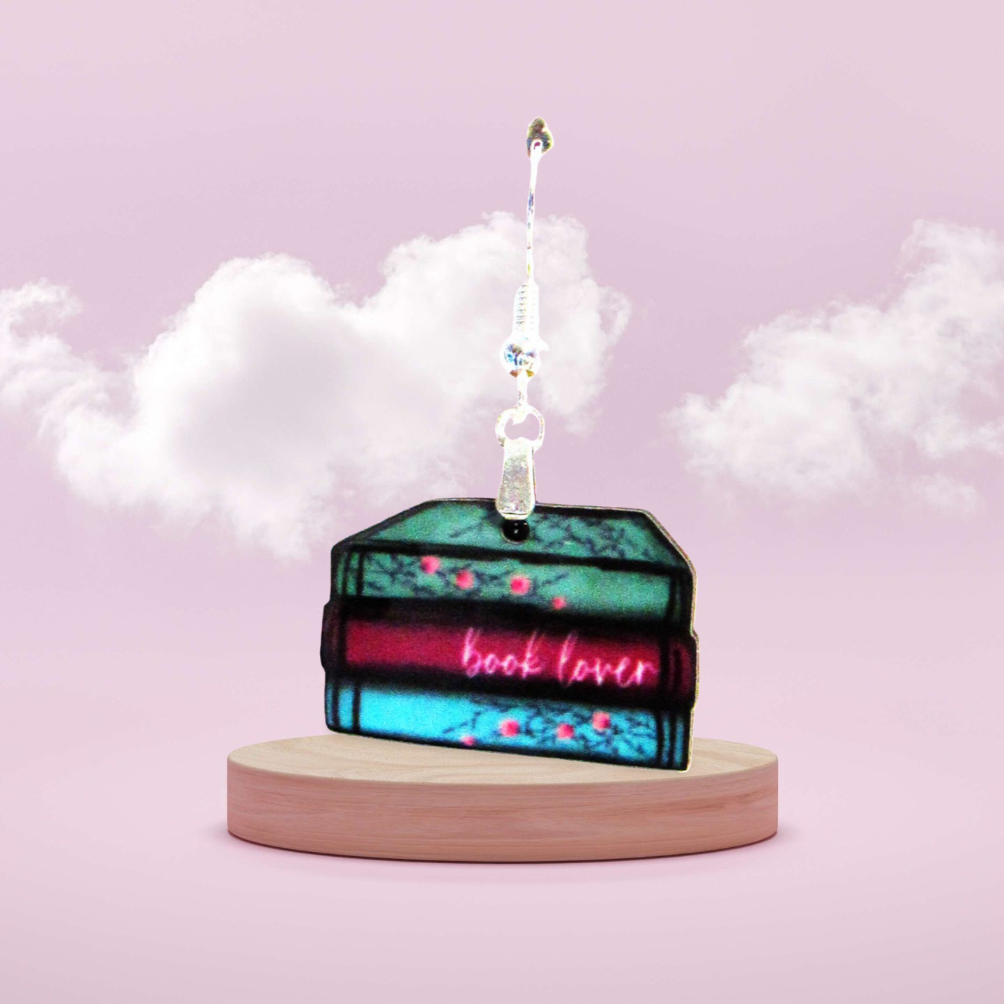 These stacked book-shaped earrings measure 1.5 inches wide with a 1-inch base and a total length of 2 inches, crafted from durable MDF. Featuring hypoallergenic wire, they offer comfortable wear for sensitive ears. Their unique design adds a charming, literary touch to any outfit, making them a perfect accessory for book lovers seeking style and comfort.