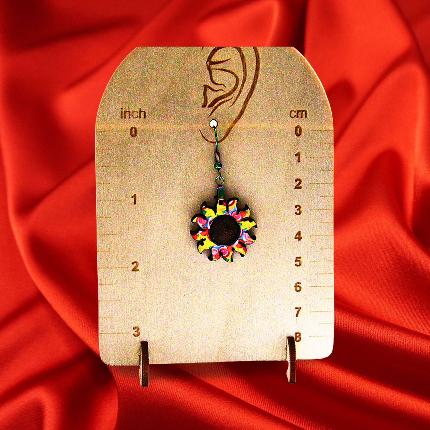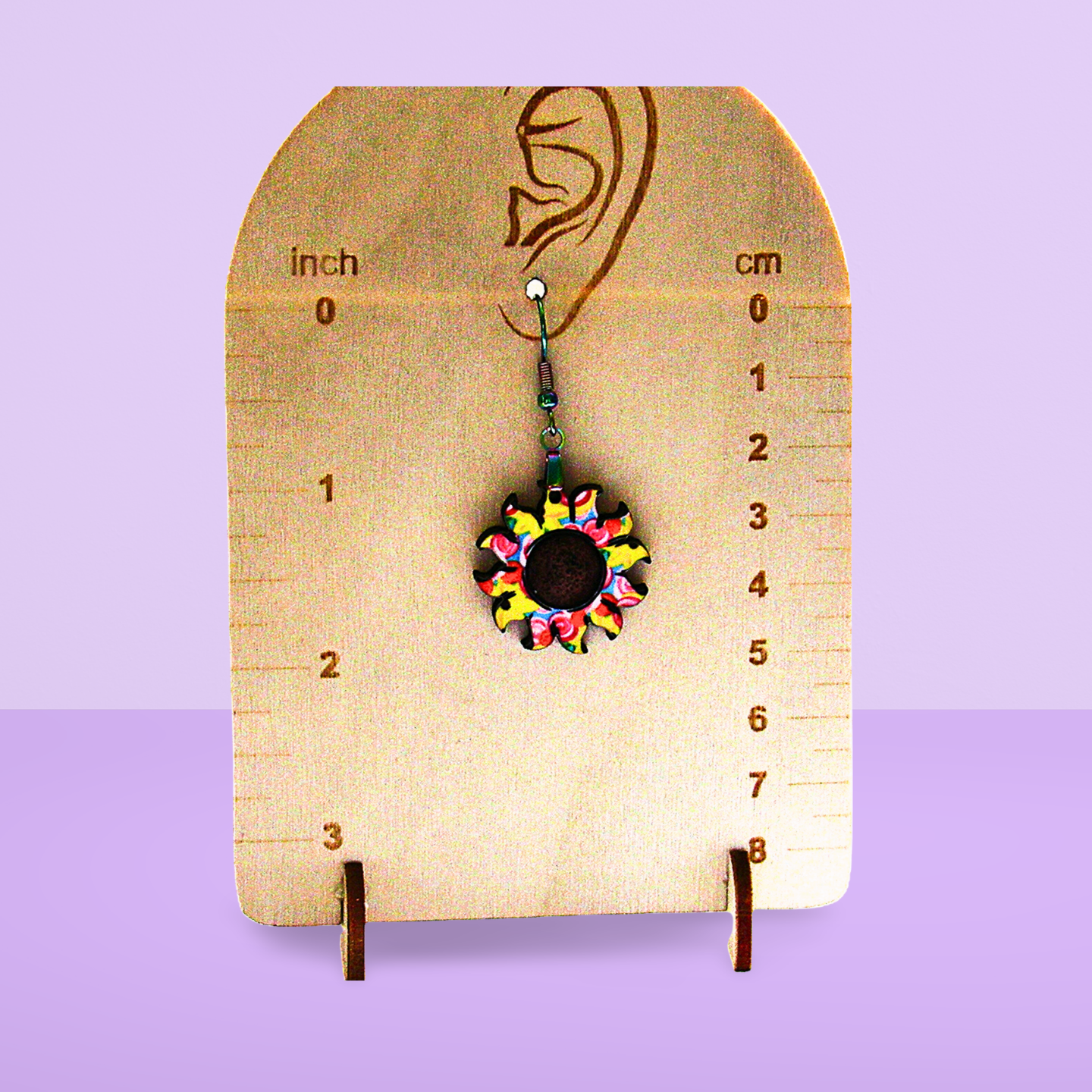 Brighten up your day with these playful sun-shaped earrings! Crafted from durable 1-inch MDF and measuring 2 inches long, they feature a vibrant multicolor flower design sublimated on one side. Lightweight and comfy, they hang from hypoallergenic wires perfect for sensitive ears. Add a splash of sunshine to any outfit with these fun, eye-catching accessories.