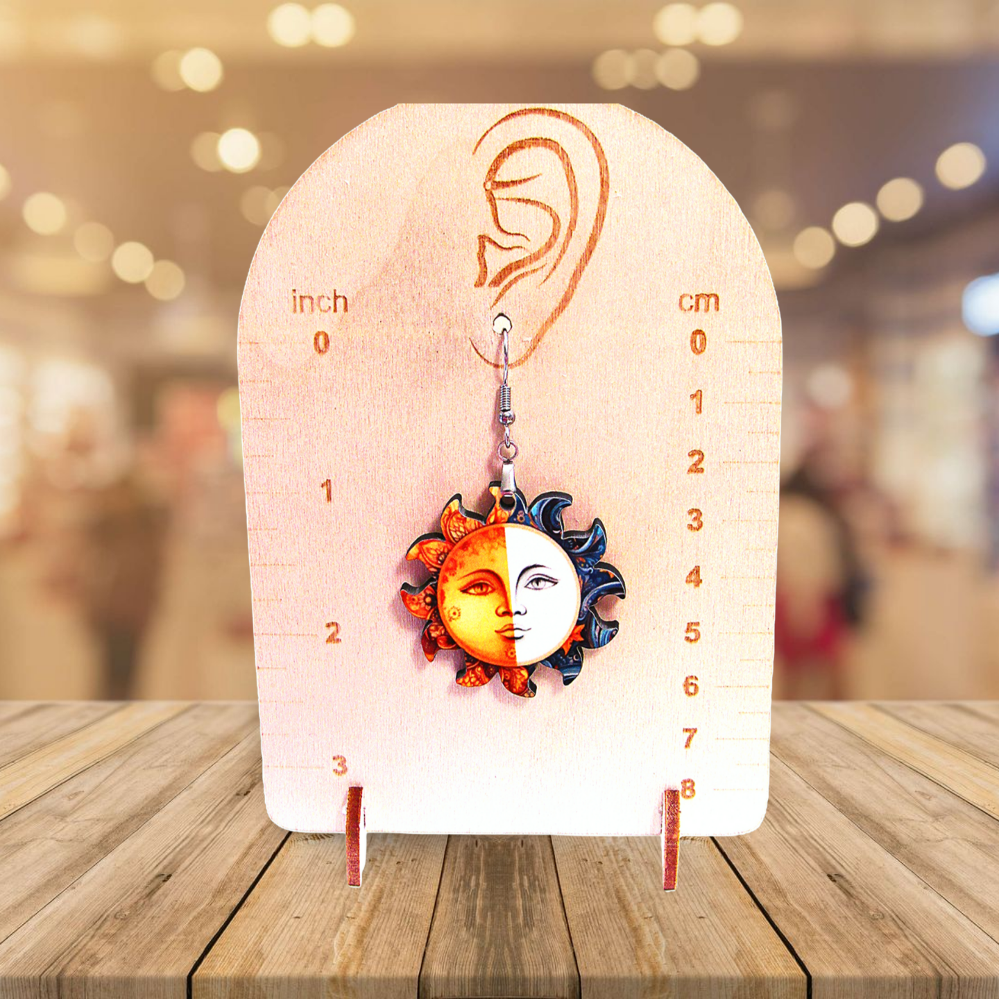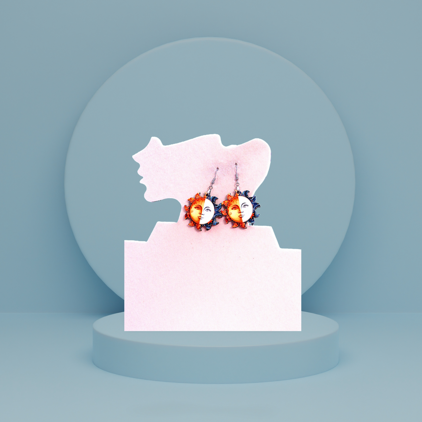 These sun-shaped sublimated earrings feature a 1.5-inch base and a total length of 2.5 inches, crafted from durable MDF with hypoallergenic wire for comfortable wear. Designed with a charming night and day theme, they add a unique touch to any outfit while being gentle on sensitive skin. Perfect for those seeking stylish, thoughtful accessories that combine creativity and comfort.