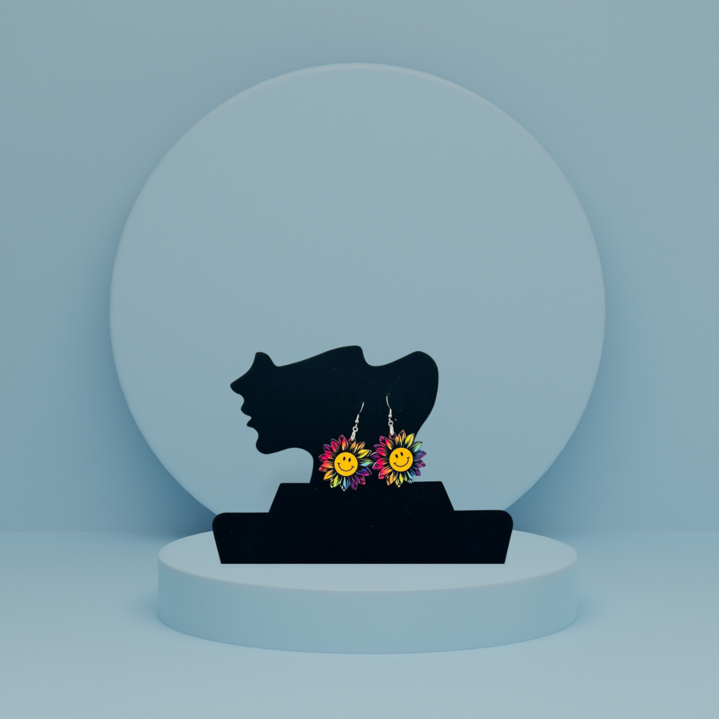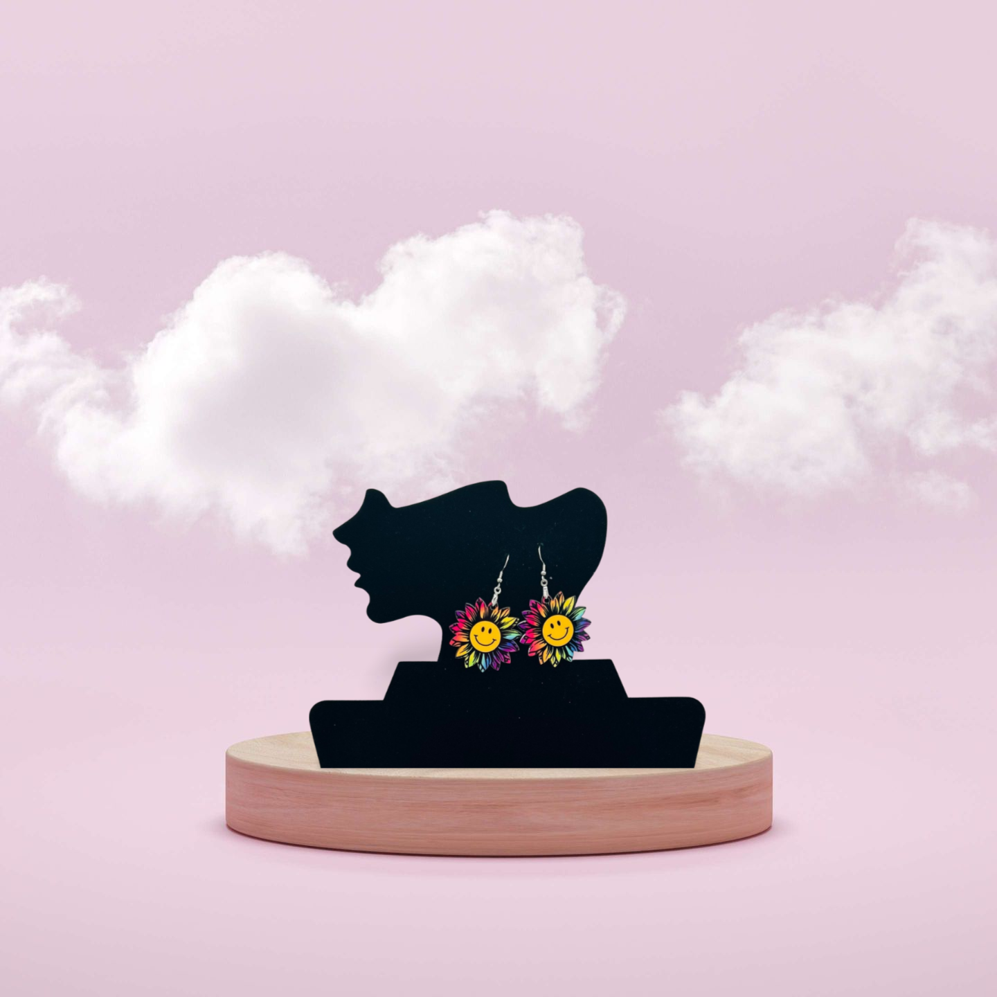 These sunflower-shaped earrings feature a 1-inch base and a total length of 2 inches, crafted from durable MDF with hypoallergenic wire for comfortable wear. Their cheerful hippie smile design adds a playful, uplifting touch to any outfit, making them a perfect accessory to brighten your day while ensuring skin-friendly comfort.