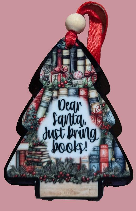 This charming tree-shaped ornament measures 3 x 2.35 inches and is crafted from durable MDF. Sublimated on one side with the heartfelt message "Dear Santa Just Bring Books," it adds a personalized touch to your holiday decor. Finished with a red ribbon and wooden bead, it’s ready to hang and spread festive cheer. Perfect for book lovers looking to celebrate the season in a unique way.