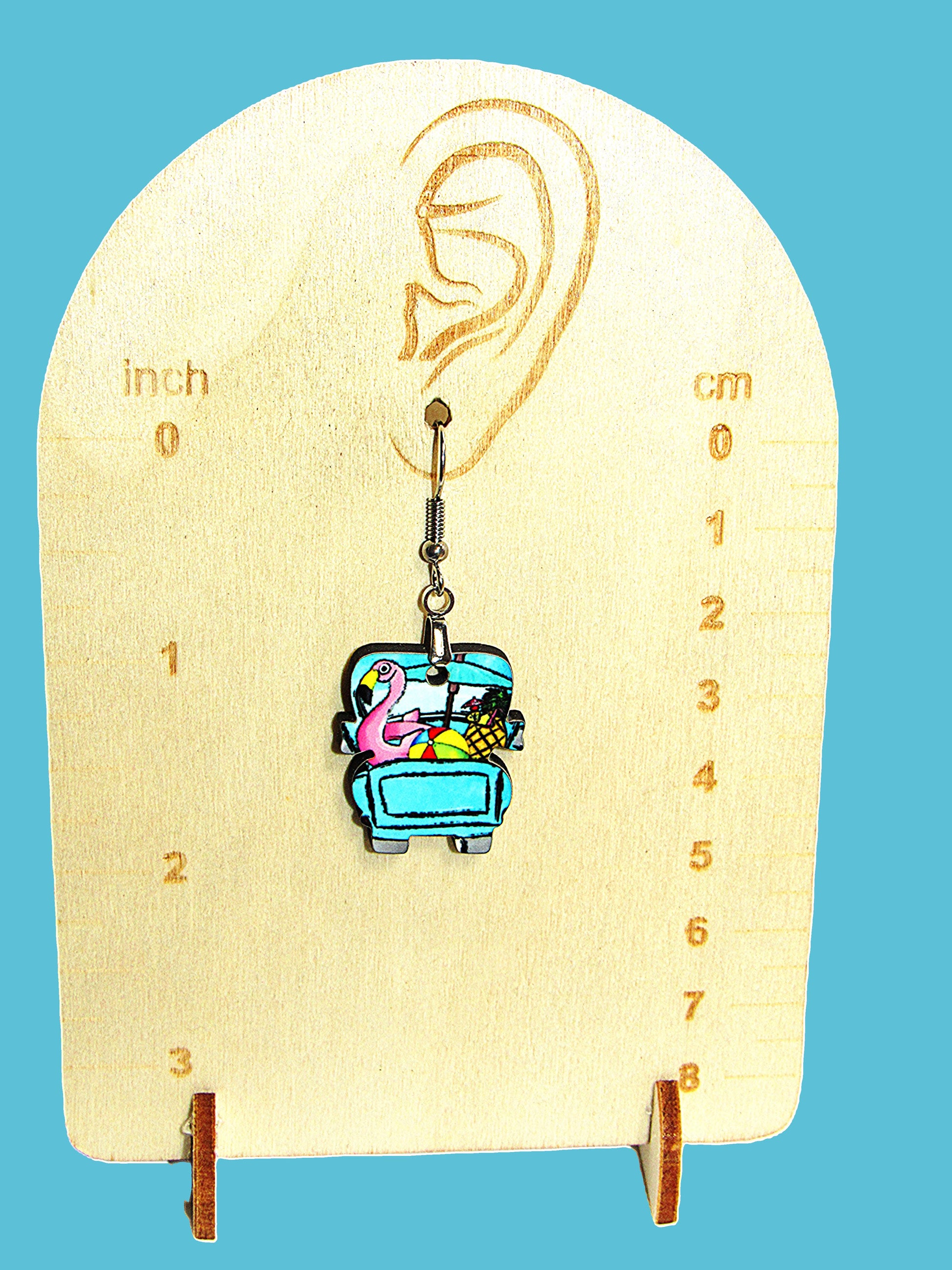 Add a splash of seaside fun to your look with these playful truck-shaped earrings! Measuring 1 inch at the base and 2 inches in total length, they’re crafted from lightweight MDF and feature hypoallergenic wire for all-day comfort. Perfect for flamingo lovers and beach vibes, these charming accessories bring a touch of sunny whimsy wherever you go.
