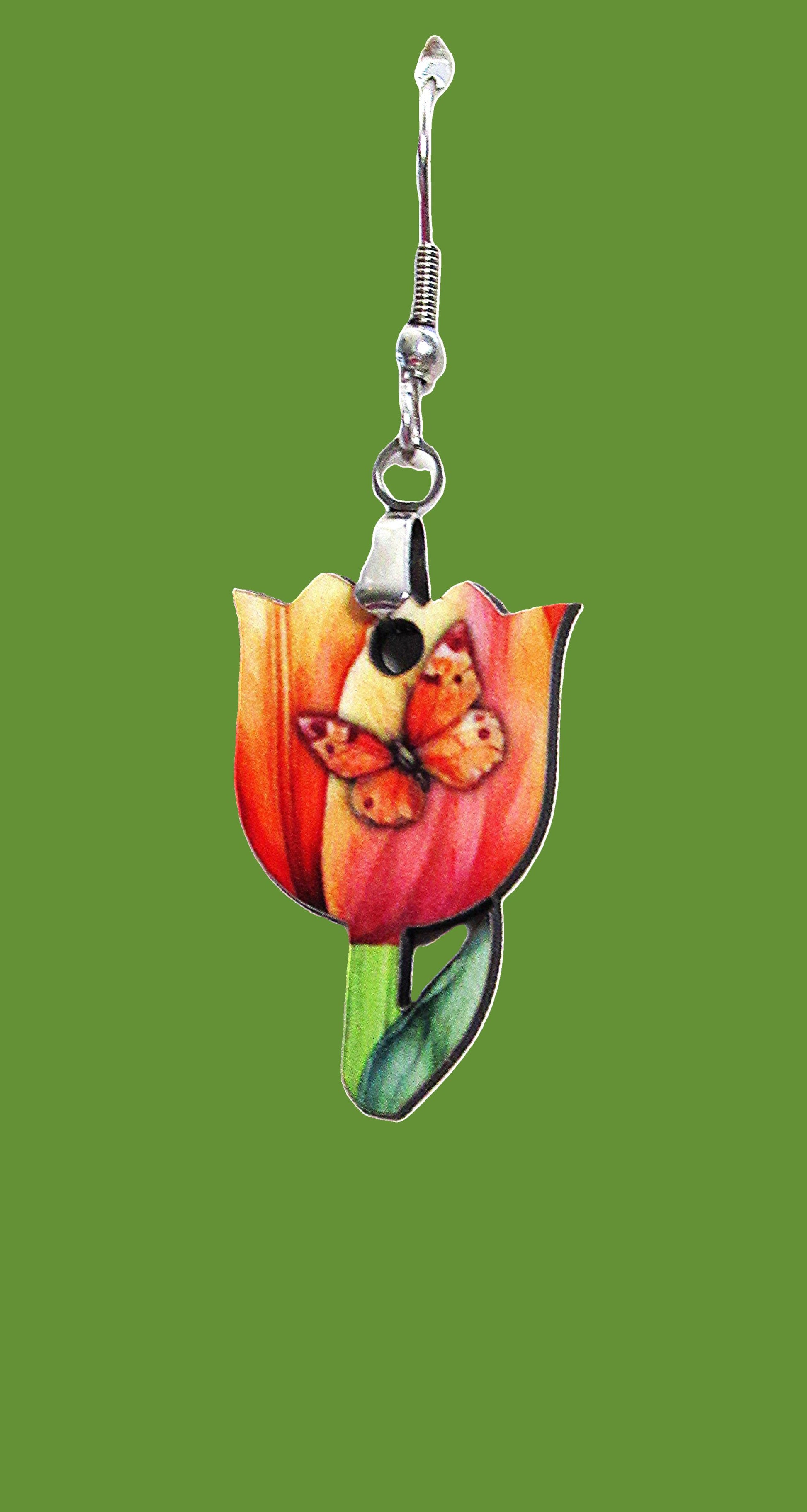 These delicate tulip-shaped earrings feature a 1-inch base and a total length of 2 inches, crafted from lightweight MDF for comfortable wear. The design showcases a charming pink tulip accented with a butterfly, adding a touch of nature-inspired elegance. Made with hypoallergenic wire, they are gentle on sensitive skin, making them a thoughtful choice for everyday wear or special occasions.