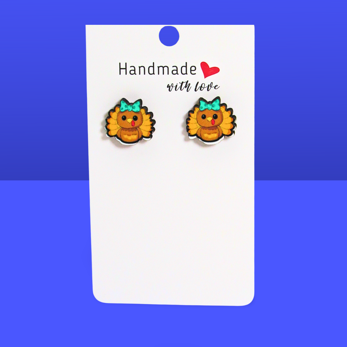 Add a fun twist to your look with these playful turkey-shaped earrings, featuring a charming mint bow. Made from durable MDF, each earring is sublimated on one side for vibrant, lasting color. The hypoallergenic wire ensures comfortable wear for sensitive ears. Perfect for those who love unique accessories with a whimsical touch.