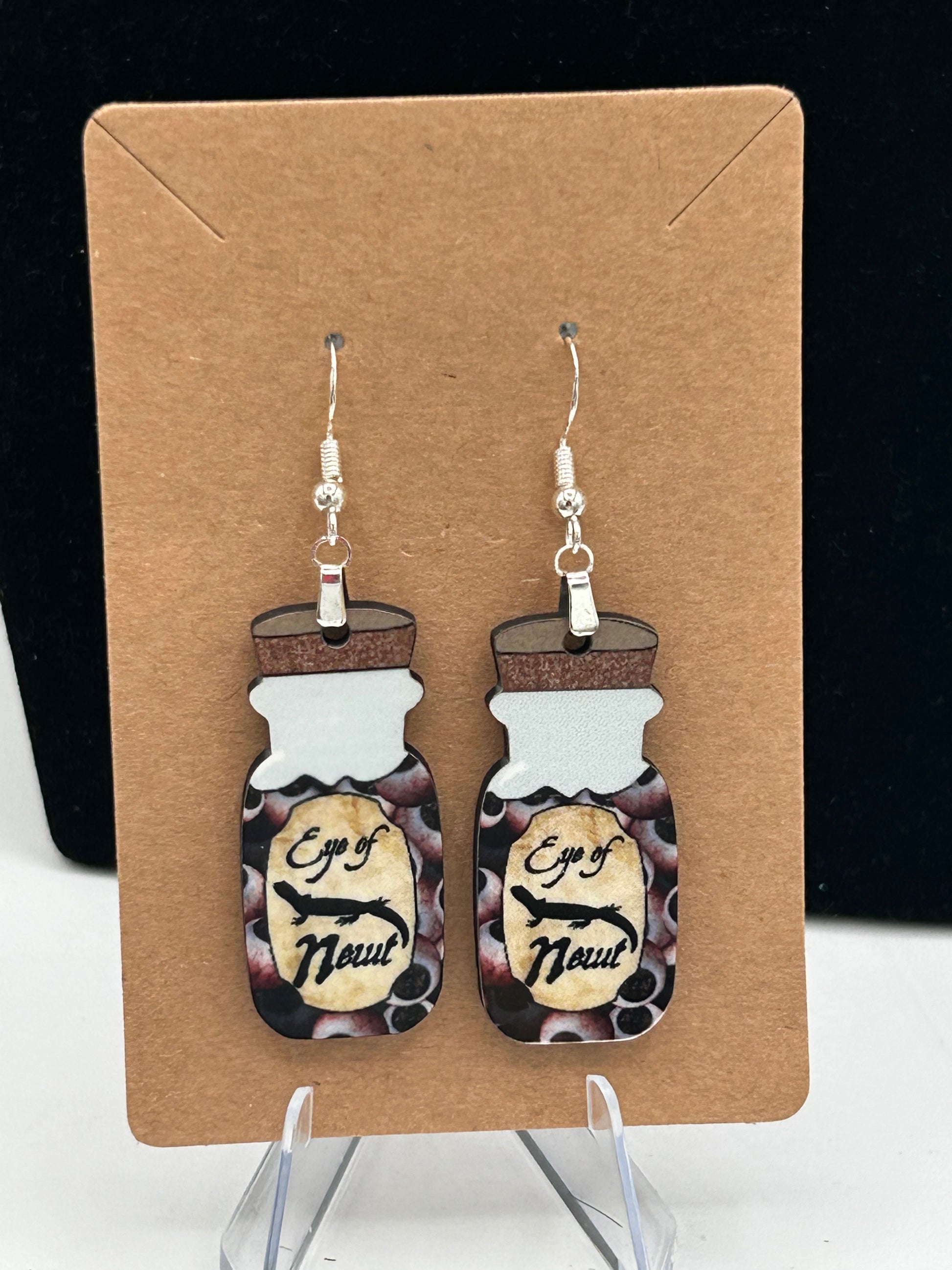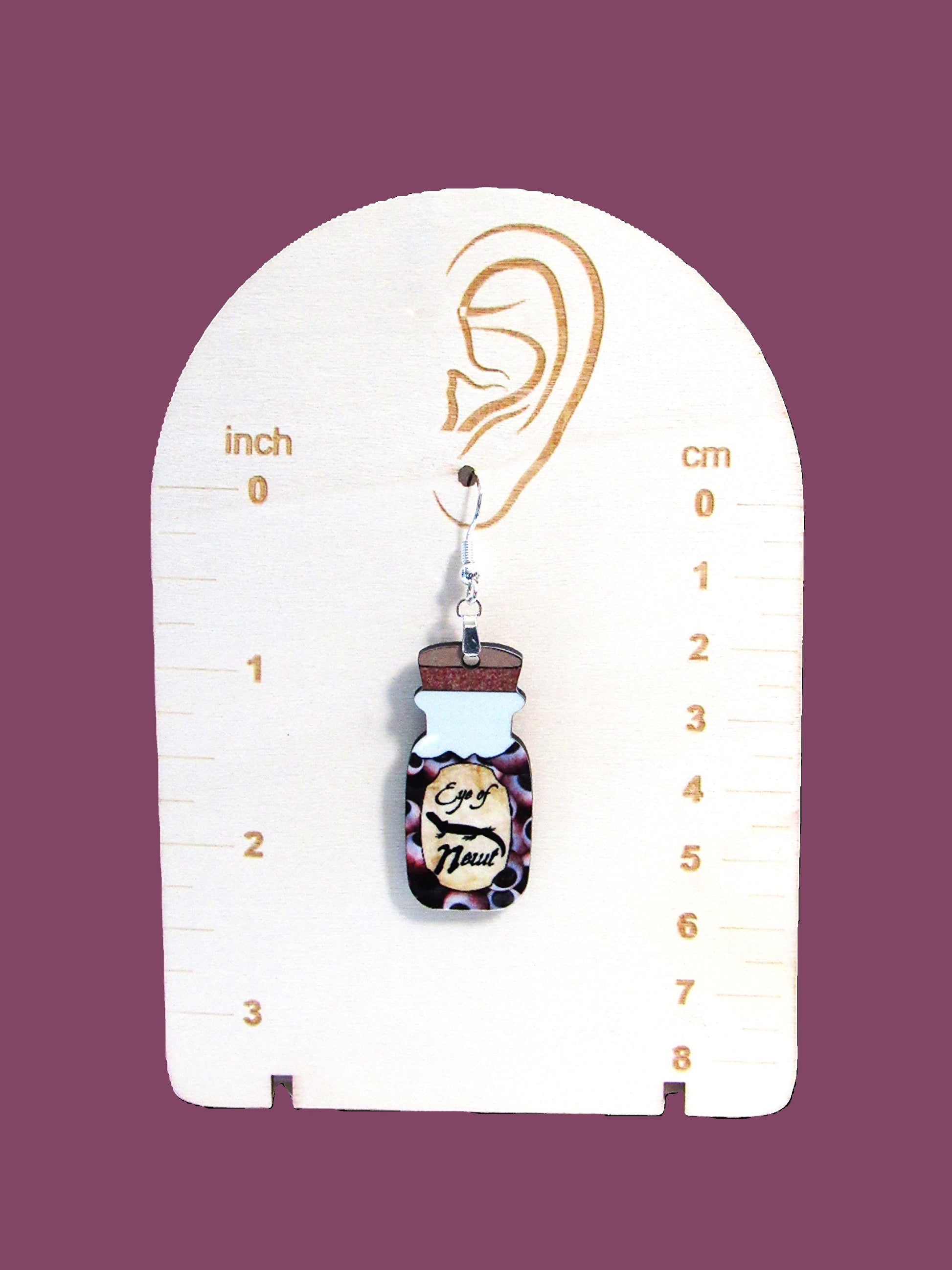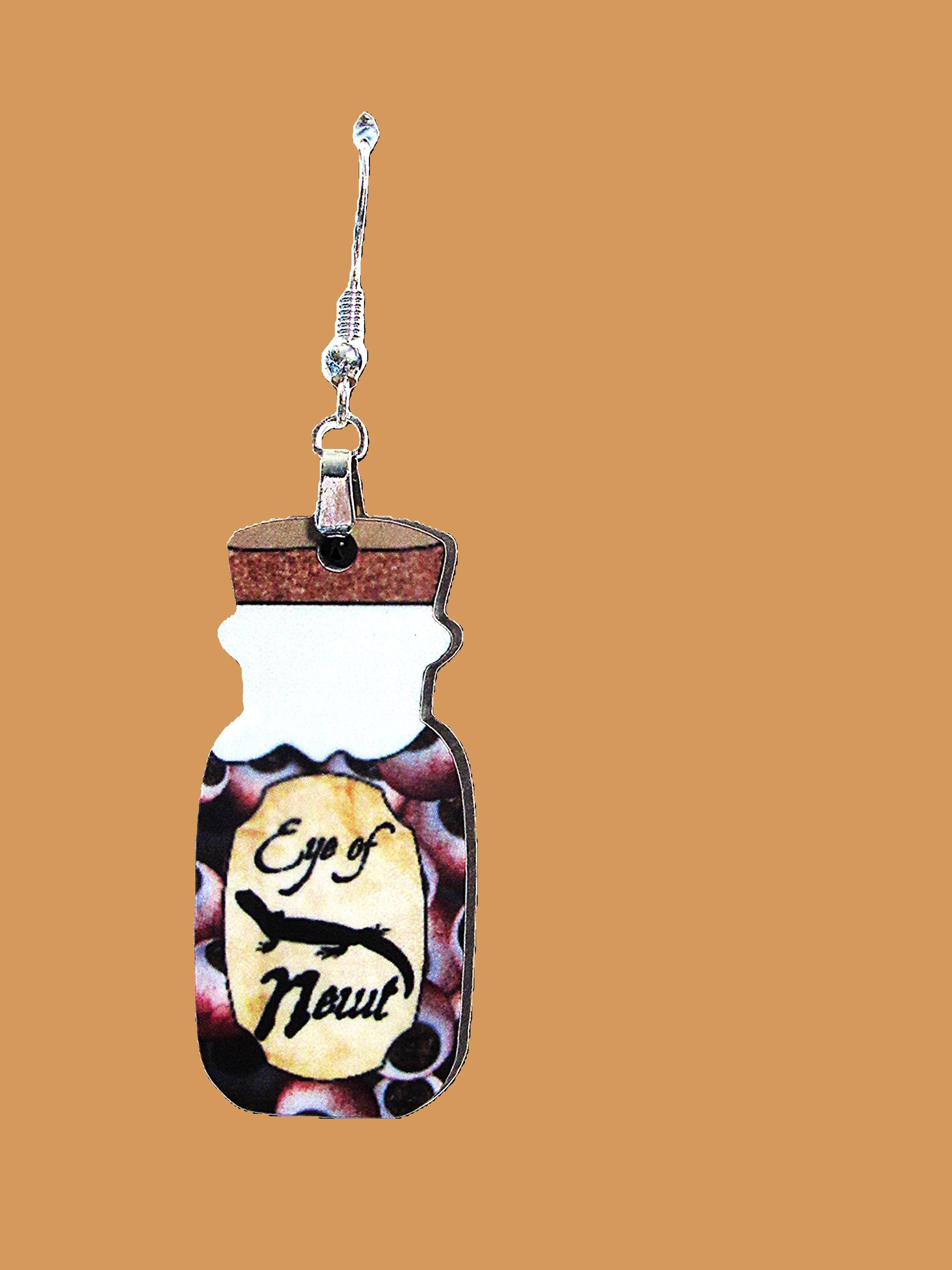 Add a dash of magic to your look with these playful Vial Shaped Sublimated Earrings. Crafted from sturdy MDF, each earring measures 1.5 inches at the base and extends to 2.5 inches long, featuring a whimsical "Eye of Newt" theme. The hypoallergenic wire ensures comfortable wear for all-day enchantment. Perfect for those who love a quirky twist on their accessories!