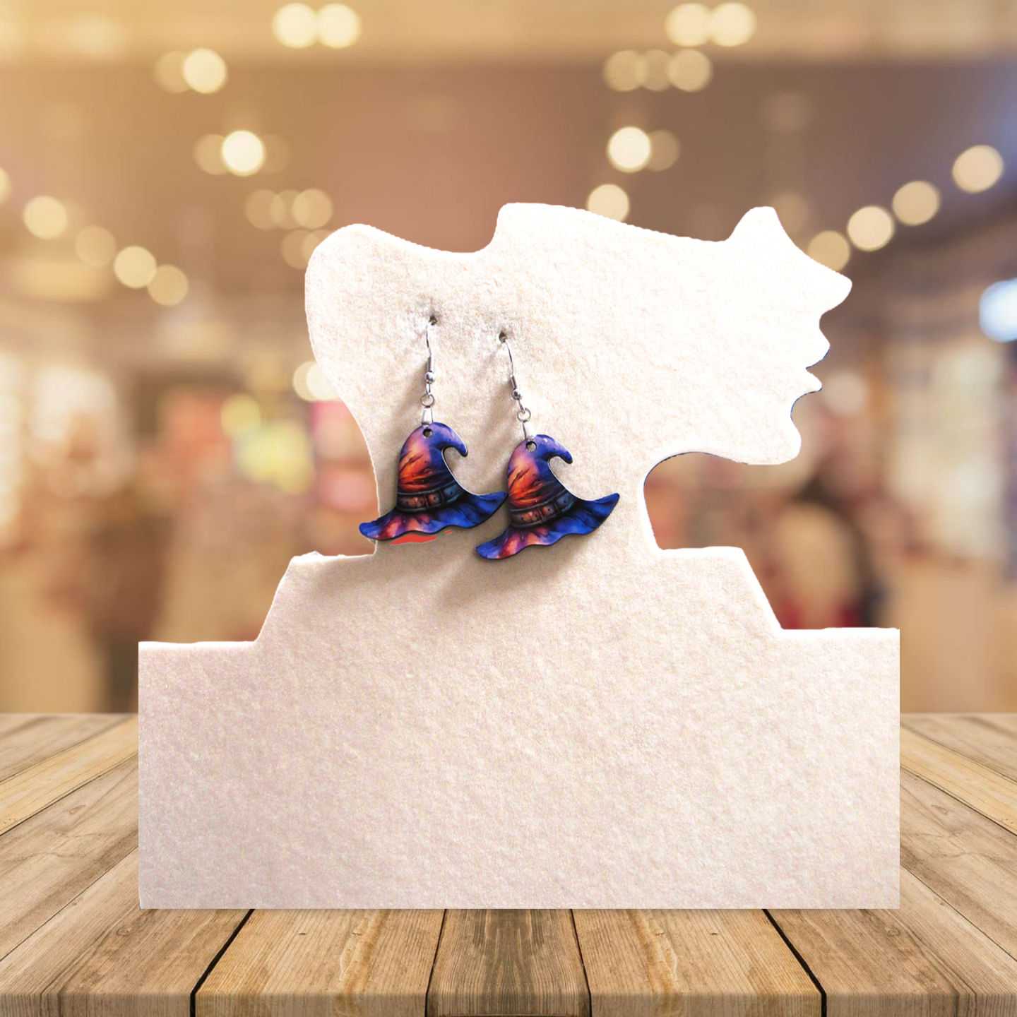 Elevate your style with these Witch Hat shaped earrings crafted from durable MDF. Measuring 1.5 inches with a total length of 2.5 inches, they feature a captivating blend of purples and blacks that add a mysterious charm to any outfit. Equipped with hypoallergenic wires, these earrings ensure comfortable wear for sensitive ears while making a bold statement at every occasion. Perfect for adding a touch of spooky elegance to your look.