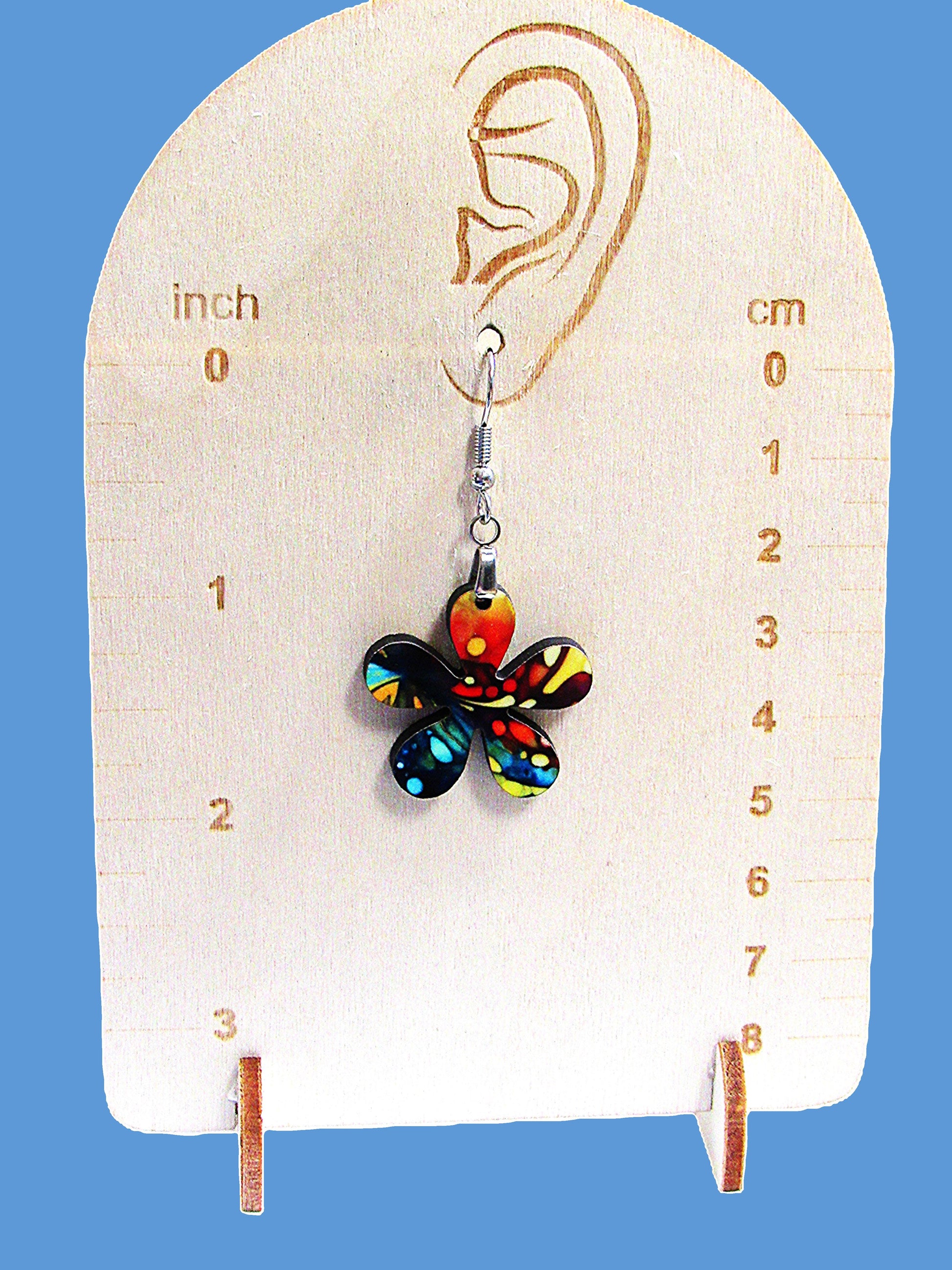 These 1-inch hippie flower-shaped earrings combine lightweight MDF with hypoallergenic wire for comfortable, irritation-free wear. Measuring 2 inches in total length, they offer a stylish, eye-catching accessory perfect for expressing your unique, free-spirited style. Durable and skin-friendly, these earrings are ideal for everyday use or special occasions.
